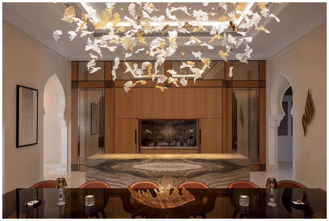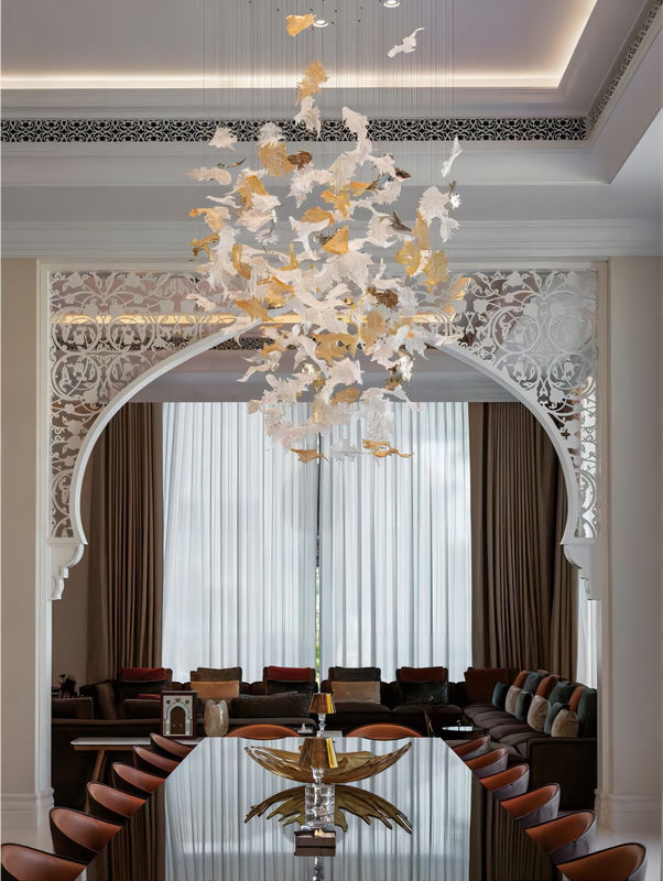 هذا المصباح غير القياسي من زجاج أوراق القيقب هو أبرز مشروع الديكور الفني في قاعة الملتقى في الفندق.تصميمها الفريد يسلط الضوء على خصائص التخصيص الشخصي والقفزات الزجاجية أوراق القيقبإنه مصباح يدمج التخصيص الشخصي والحرفية الرائعة والديكور الفني ، مما يجلب متعة بصرية فريدة من نوعها وخلق جو في قاعة ضيافت الفندق.