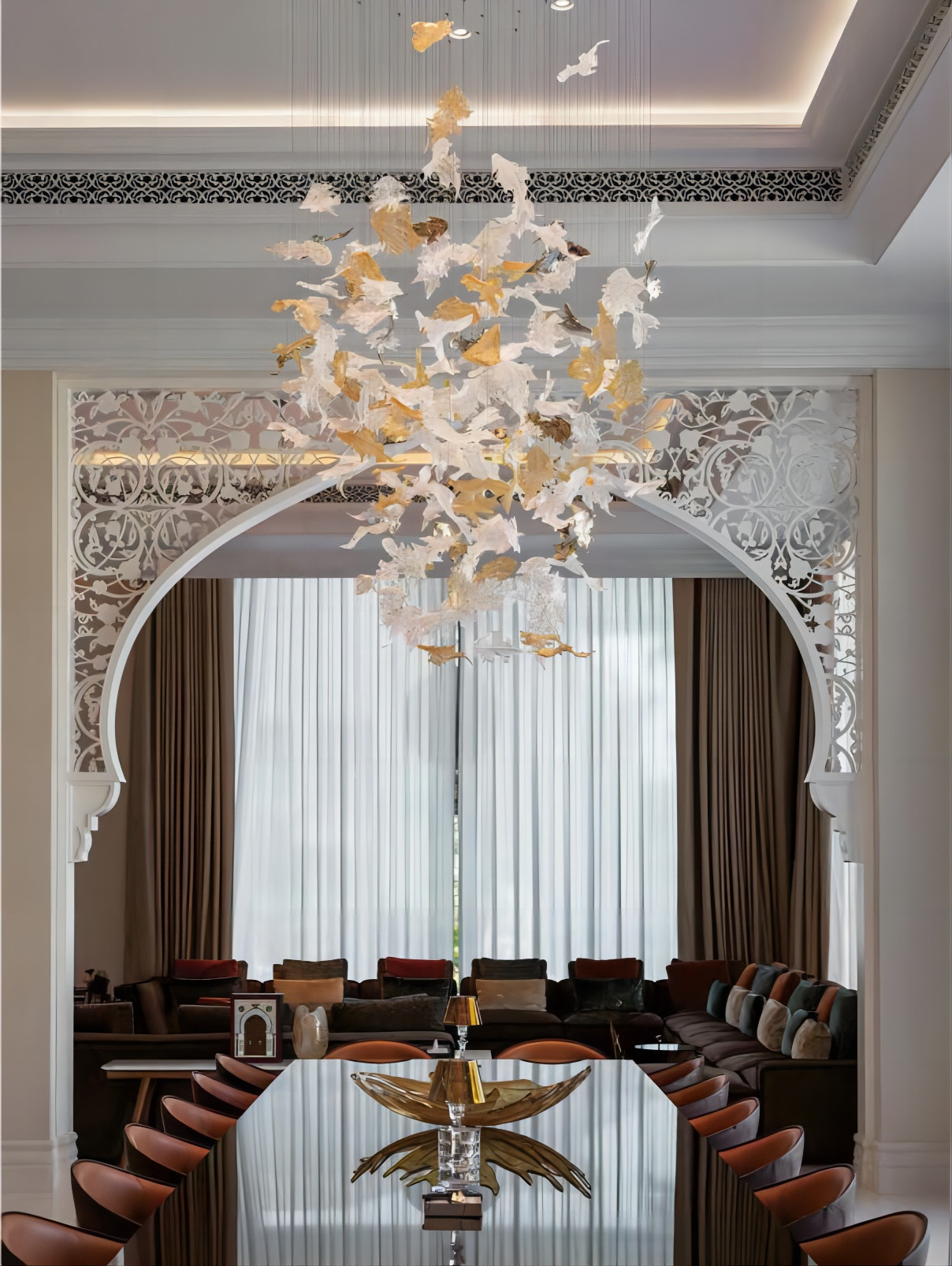 هذا مصباح أوراق القيقب المخصص مستوحى من أوراق القيقب و يجمع بين أنيقة أوراق القيقب مع الإضاءة لإنشاء مصباح فني ومزخرف للغاية.كل قلادة من أوراق القيقب مصنوعة بحرفية زجاجية رائعة، يظهر نسيج ومخطط أوراق القيقب ، شبيه بالحياة. الشكل الكلي للثريا اللاصقة أوراق القيقب هو أنيق وفريد من نوعه. إنه جهاز إضاءة وعمل فني ،يدمج تماما في موضوع الزخرفة من قاعة الملتقى.